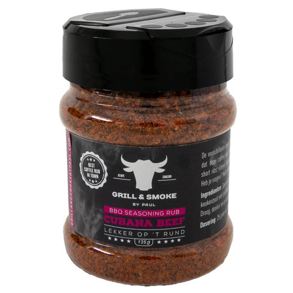 De verschillende specerijen in combinatie met gemalen koffiebonen zorgen ervoor dat deze coffee rub heerlijk is op onder andere pulled beef, brisket, picanha, short ribs, ribeye, tomahawk of bavette. De Cubana rub is ook uitermate geschikt voor wild gerechten. Heb je vragen? Mail: info@grillandsmokebypaul